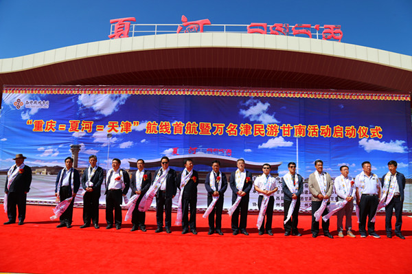 中国甘南网讯 (记者 张佳 )草原盛夏花正艳,神鹰翱翔送吉祥。7月31日,随着一架标有“西藏航空”的空客A319型客机载着第一批来自天津的客人平稳降落在夏河机场,标志着新开通的“重庆—夏河—天津”航线正式通航,并举行了隆重的首航仪式暨万名津民游甘南活动启动仪式。